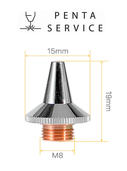 Сопло PENTA SERVICE, диаметром 15 мм, имеет диаметр отверстия 1,2 мм, произведено из меди с соблюдением всех необходимых стандартов качества, технических и геометрических параметров изделий данного типа. В результате применения, сопло гарантирует сохранение расчётных параметров в течение длительного времени и обеспечивает высокую мощность работы оборудования лазерной резки. Электролитическое хромирование поверхности сопла максимизирует срок эксплуатации, сокращает адгезию при разбрызгивании и обеспечивает стабильное определение высоты.