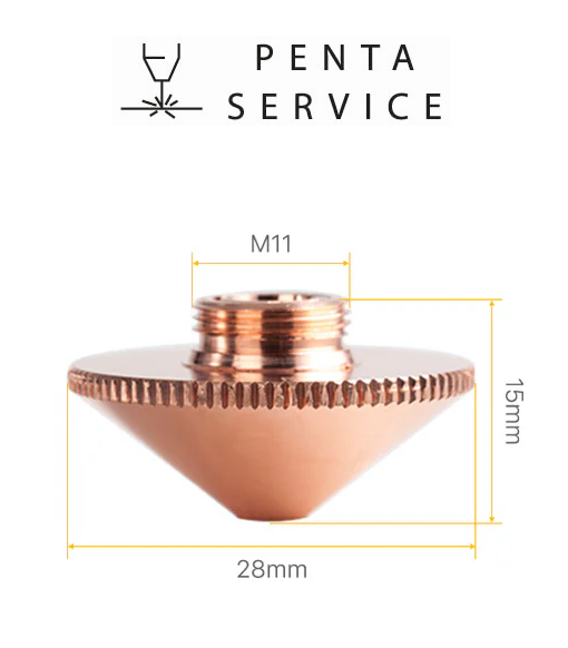 Сопло PENTA SERVICE диаметром 28 мм, высотой 15 мм. Имеет диаметр отверстия 1,4 мм, произведено из меди с соблюдением всех необходимых стандартов качества, технических и геометрических параметров изделий данного типа. В результате применения, сопло гарантирует сохранение расчётных параметров в течение длительного времени и обеспечивает высокую мощность работы оборудования лазерной резки.