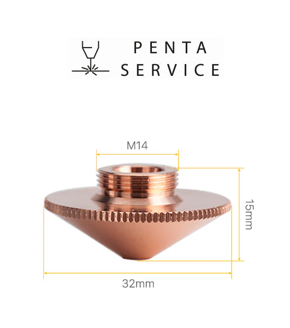 Сопло PENTA SERVICE высотой 15 мм, диаметром 32 мм, имеет диаметр отверстия 1,0 мм и резьбу М14, произведено из меди с соблюдением всех необходимых стандартов качества, технических и геометрических параметров изделий данного типа. В результате применения, сопло гарантирует сохранение расчётных параметров в течение длительного времени и обеспечивает высокую мощность работы оборудования лазерной резки.